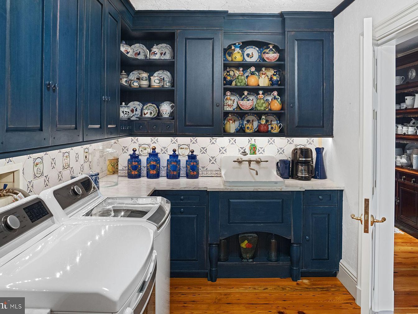 This charming laundry room showcases rich navy cabinetry paired with a bright, clean design. The spacious layout features a sleek countertop for sorting and folding clothes, complemented by a vintage-inspired sink adding character. Above, open shelving displays an array of vividly colored pottery, enhancing the room’s aesthetic appeal and reflecting a warm, family-friendly atmosphere. The delicate tile backsplash with floral motifs contrasts elegantly, creating visual interest against the darker cabinetry. Practical appliances are seamlessly integrated, ensuring functionality without sacrificing style, making this space an inviting and efficient area for household tasks.