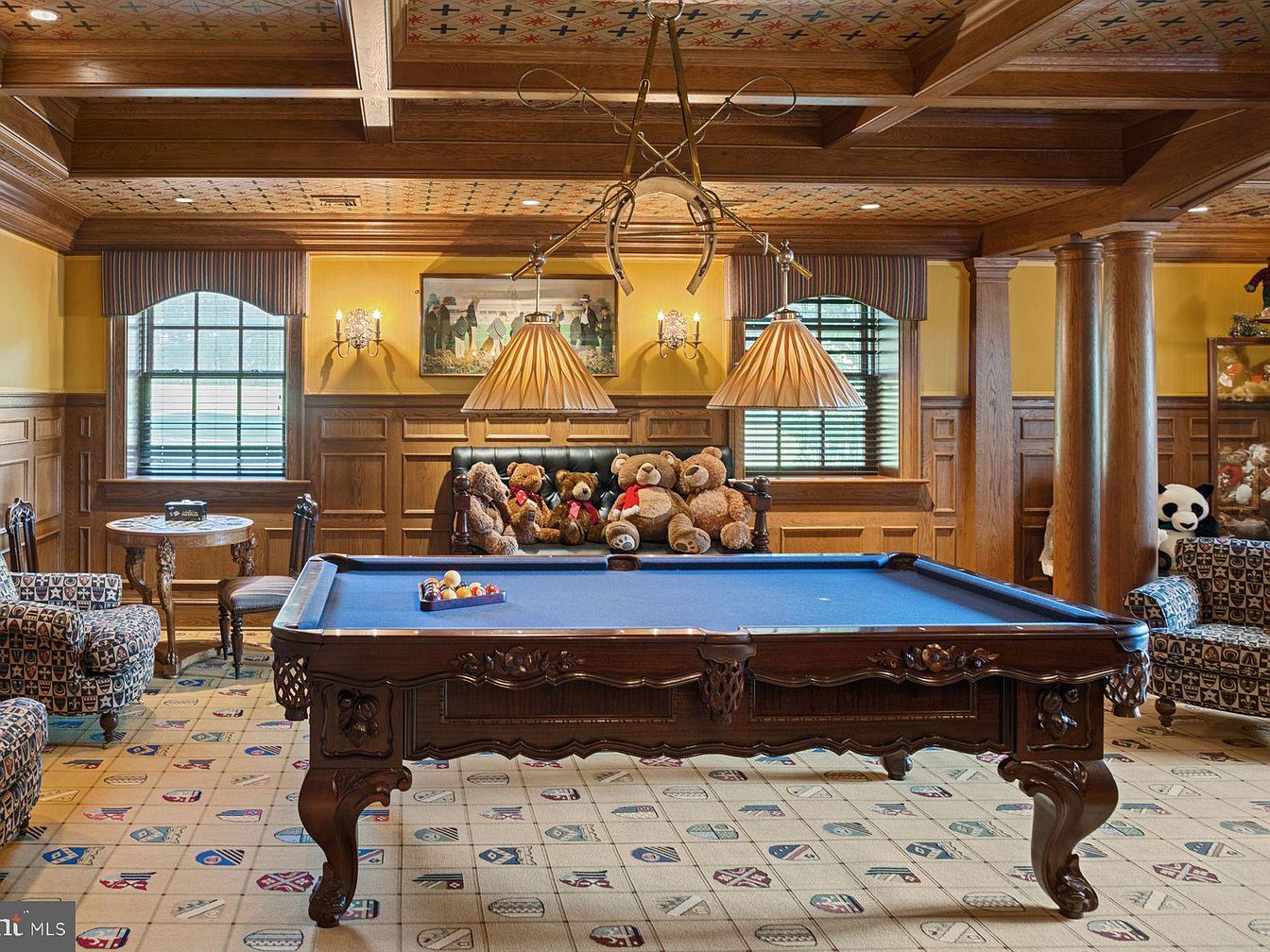 This game room exudes warmth and charm with its rich wood paneling and intricate coffered ceiling. The pool table, a centerpiece, showcases ornate detailing while vibrant blue felt invites friendly competition. Comfortable seating arrangements, including plush armchairs and a cozy loveseat adorned with playful teddy bears, create a relaxed atmosphere perfect for family gatherings. The soft yellow walls enhance the inviting feel, complemented by whimsical patterned carpeting that adds character. Ample natural light filters through the elegantly curtained windows, illuminating the space while decorative sconces provide a soft glow, making this room an ideal retreat for leisure and fun.