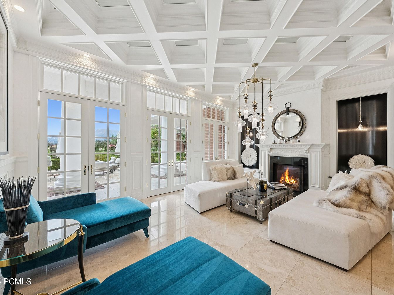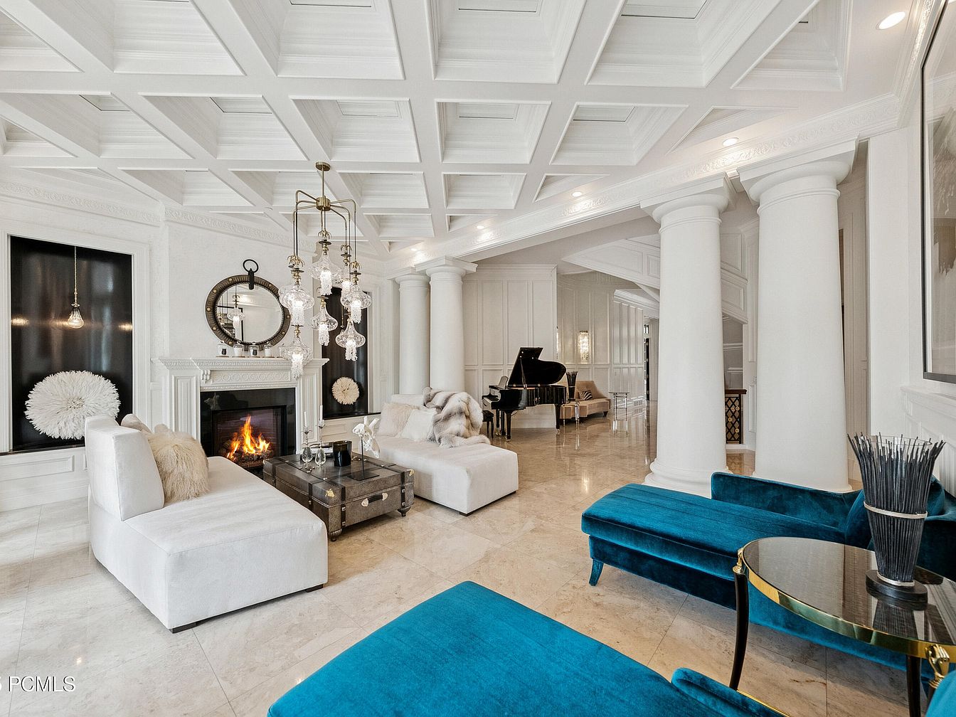 This stunning living room showcases a harmonious blend of luxury and comfort, featuring a spacious layout bathed in natural light from expansive glass doors leading to an outdoor oasis. The coffered ceiling adds architectural interest, while sleek marble floors enhance the elegance of the space. Plush, modern seating in deep teal contrasts beautifully with soft white furnishings, creating a welcoming atmosphere. A chic coffee table adds a touch of sophistication, complemented by a cozy fireplace that invites family gatherings. With its neutral palette and stylish decor, this room perfectly balances contemporary design with homey warmth, ideal for relaxation and entertaining.
