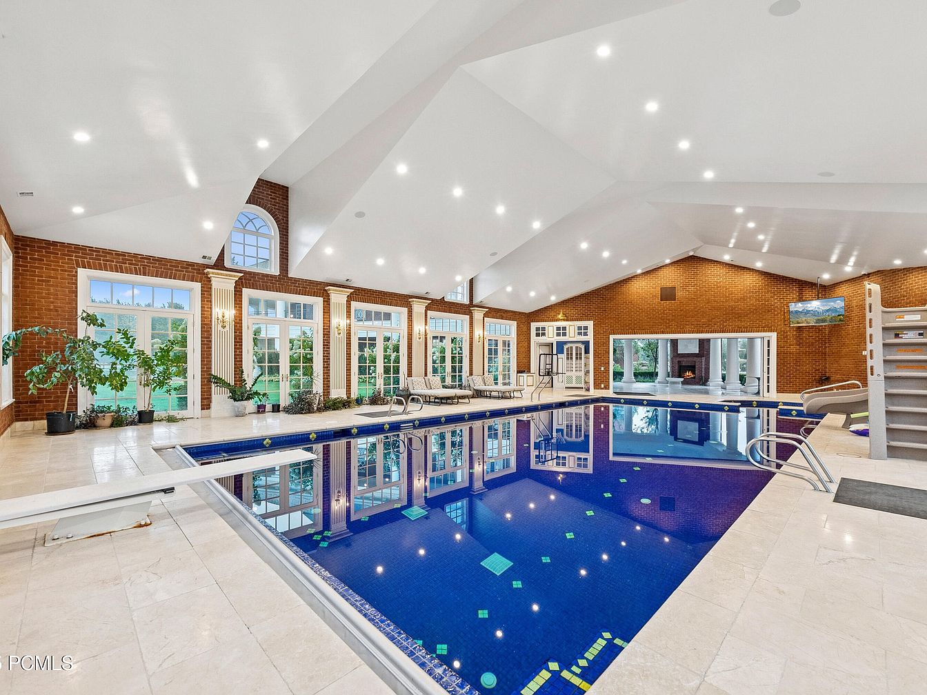 This stunning indoor pool area features an elegantly designed space that merges luxury with leisure. High vaulted ceilings reveal modern lighting and architectural details, enhancing the inviting atmosphere. Large windows line the walls, flooding the area with natural light and providing beautiful views of the outdoors. The pool, adorned with a vibrant tiled pattern, reflects the chic ambiance. Surrounding the pool, comfortable lounge chairs and greenery create a relaxing environment, perfect for family gatherings. The layout encourages seamless movement, with a diving board and a slide, making it an ideal space for both relaxation and fun-filled activities.