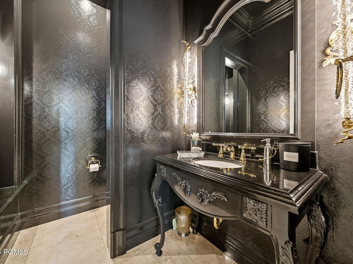 This exquisite powder room showcases a striking blend of sophistication and modern design. The walls are adorned with a rich, textured black wallpaper, exuding elegance and depth. A beautifully crafted vintage-style vanity in glossy black features intricate carvings and a sleek granite countertop, providing both style and functionality. The polished gold fixtures add a touch of luxury, harmonizing perfectly with the opulent ambiance. Soft lighting from sconces flanks the elaborately framed mirror, enhancing the space’s charm. This powder room exemplifies a chic retreat, perfect for guests, while maintaining a cozy, family-friendly atmosphere.
