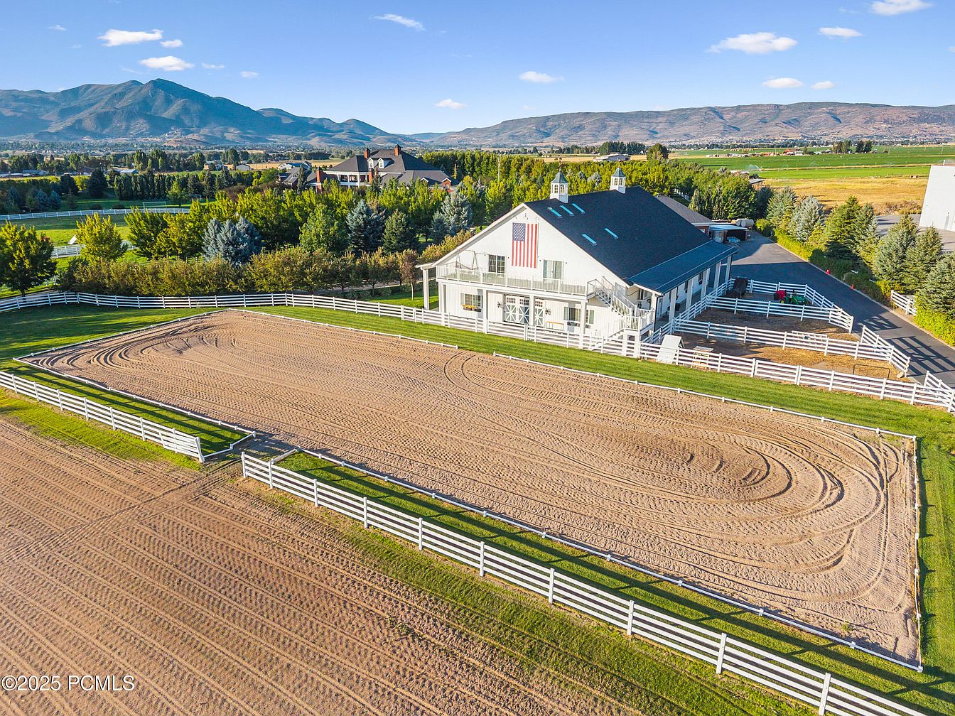 This stunning equestrian retreat combines rustic charm with modern elegance, showcasing a spacious layout ideal for horse enthusiasts. The house features a welcoming facade, accentuated by a classic American flag and vibrant green landscaping that complements the scenic mountain backdrop. The equestrian arena nearby boasts meticulously maintained sand footing, perfect for riding or training. Fenced paddocks and ample open space provide a safe environment for animals and family alike. The perfect blend of function and style, the residence boasts large windows that flood the interior with natural light, ensuring warmth and comfort for all ages in this idyllic setting.
