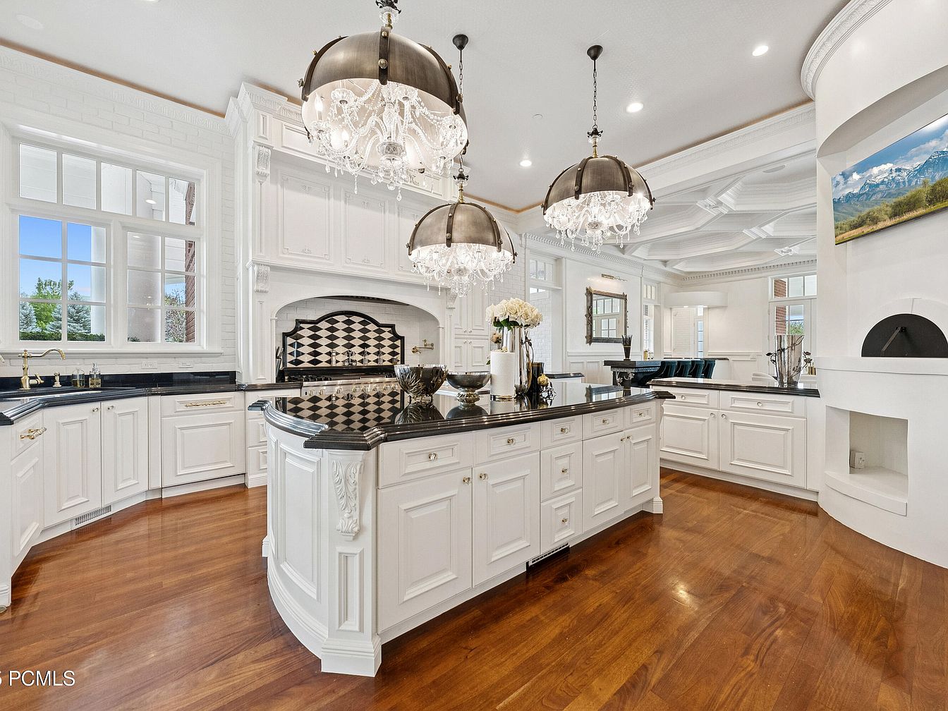 This stunning gourmet kitchen exudes sophistication and functionality, featuring a harmonious blend of white cabinetry and rich black countertops. The spacious layout offers ample storage and workspace, enhancing family gatherings. Intricate crown molding and coffered ceilings add architectural interest, while large windows flood the space with natural light. Elegant pendant lights with a vintage flair and crystal accents elevate the design, creating a warm ambiance. A stylish, tiled alcove houses the range, showcasing beautiful geometric patterns. Ideal for culinary enthusiasts, this kitchen beautifully balances practicality and aesthetic appeal, making it the heart of the home.