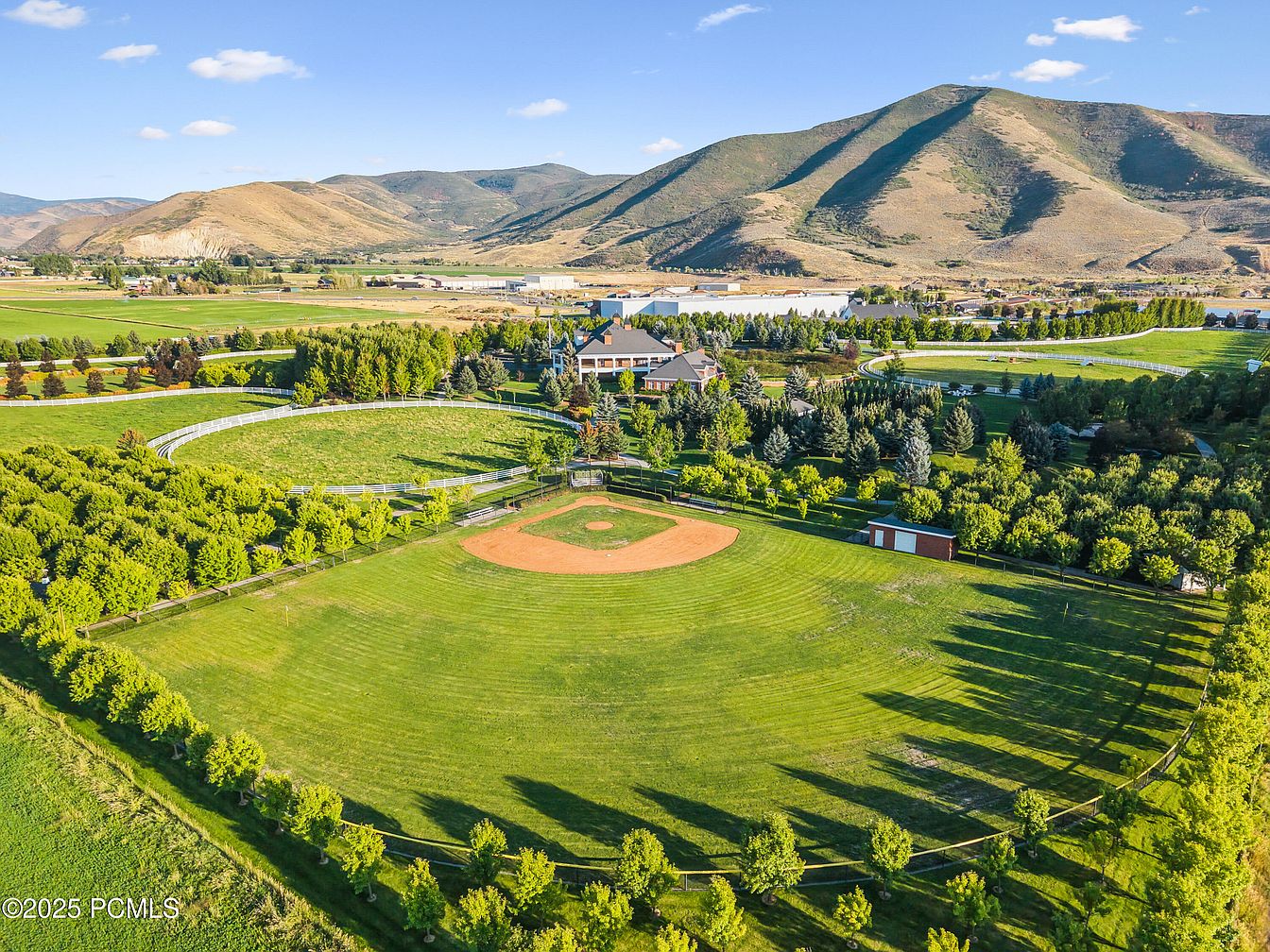 This expansive outdoor space features a perfectly manicured baseball field, surrounded by lush greenery and tall trees. The layout brilliantly integrates nature with recreation, making it ideal for family activities and gatherings. The vibrant green grass contrasts beautifully with the deep blue sky, while the impressive mountains in the background add a majestic touch to the scenery. A winding path invites exploration, leading to the main home, where elegant architecture complements the natural landscape. This outdoor setting not only promotes a healthy lifestyle but also offers a peaceful retreat, perfect for enjoying the fresh air and picturesque views.
