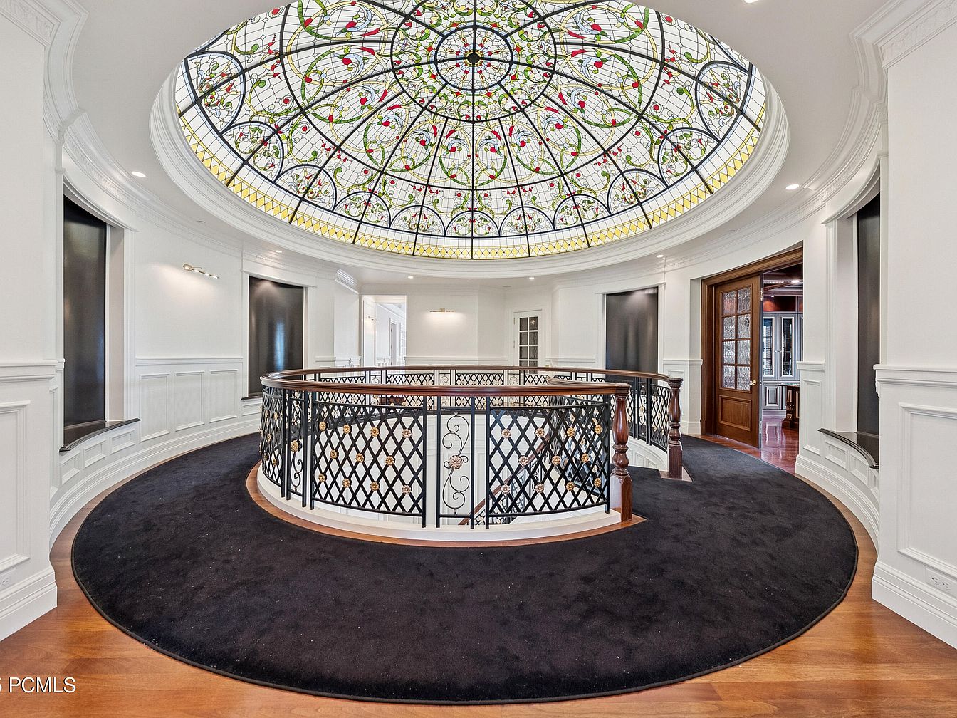 This stunning grand foyer showcases an impressive circular layout, designed with elegance and functionality in mind. A striking stained glass dome provides a breathtaking focal point, allowing natural light to flood the space in vibrant hues. The intricate wrought iron railing surrounds the balcony, adding an artistic touch while enhancing safety for families. Soft, plush carpeting complements the rich hardwood floors, creating a warm and inviting atmosphere. Sleek, modern accents meet classic architectural details, not only reflecting a timeless aesthetic but also accommodating family gatherings with ease. Each element harmoniously blends, setting the tone for the luxurious home beyond.