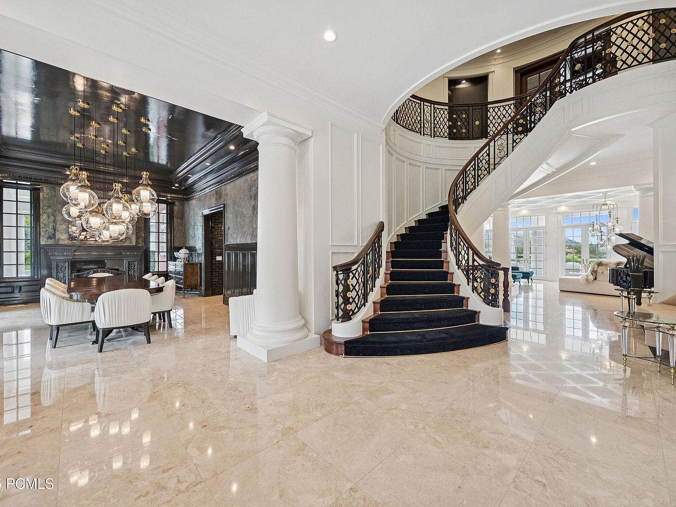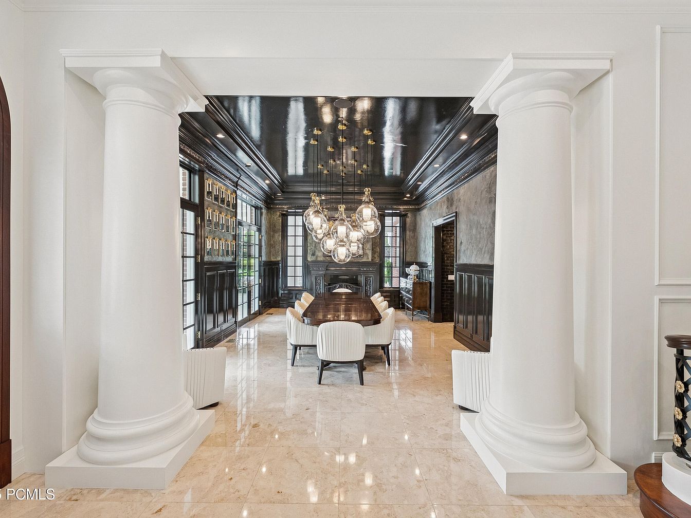 This stunning entryway welcomes guests with its grand staircase and elegant design. The polished marble floor reflects the light streaming through expansive windows, elevating the space’s brightness. The intricate black ceiling contrasts beautifully with the muted walls, creating a sophisticated atmosphere. A remarkable chandelier hangs overhead, adding a touch of luxury. The open layout seamlessly connects the entryway to the spacious living area, fostering a warm, inviting feel. Family-friendly features include ample seating at the dining table beneath artistic lighting, while the classic architectural columns and stylish decor enhance the home’s overall charm and elegance.