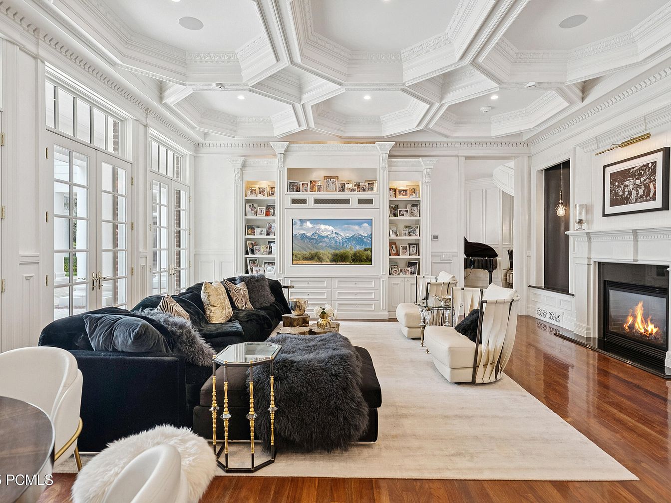 This elegant living room showcases a harmonious blend of comfort and sophistication. The layout features a plush black sofa adorned with decorative pillows and a cozy fur throw, inviting relaxation. A chic glass coffee table complements stylish accent chairs that enhance the space’s inviting atmosphere. Architectural details abound, from the coffered ceiling to the intricate molding, creating a sense of grandeur. Natural light floods through French doors, illuminating the light hardwood floors and bringing warmth to the space. The fireplace, framed with classic molding, adds a cozy touch, making this room perfect for family gatherings and entertaining.
