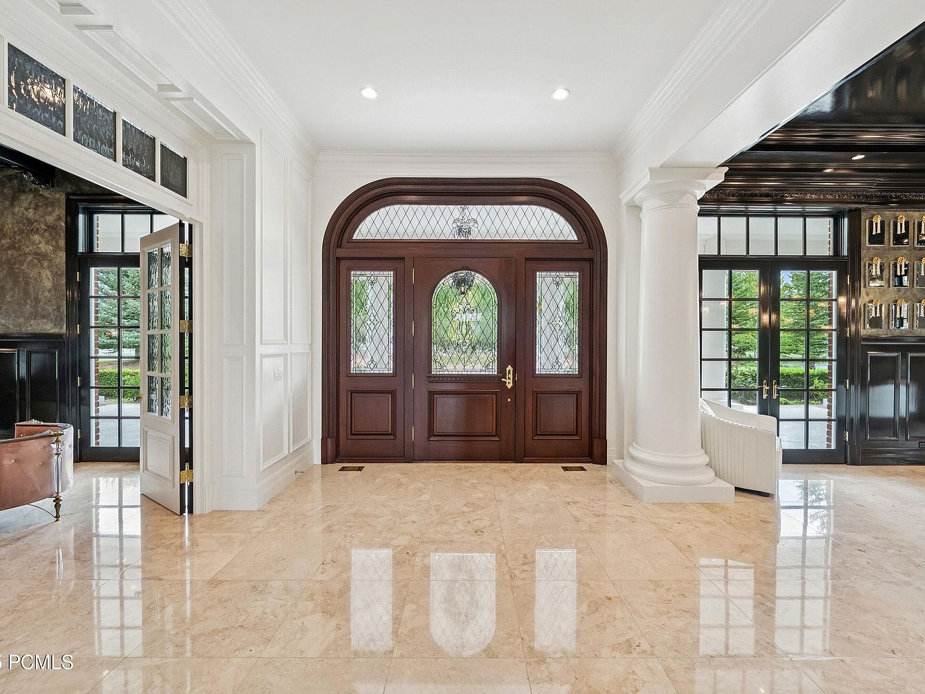 Welcome to this stunning entryway, featuring an impressive arched wooden door adorned with elegant glass panes that invite natural light. The grand design showcases tall columns and meticulously crafted moldings, creating a refined atmosphere. Neutral marble flooring enhances the spacious feel while reflecting light beautifully. The open layout offers a seamless transition to adjacent rooms, perfect for family gatherings. Rich dark wood accents complement the bright walls, adding warmth. Flanking the entrance are sophisticated double doors leading to additional living spaces, while large windows ensure a bright, airy ambiance, making this entryway as functional as it is beautiful.