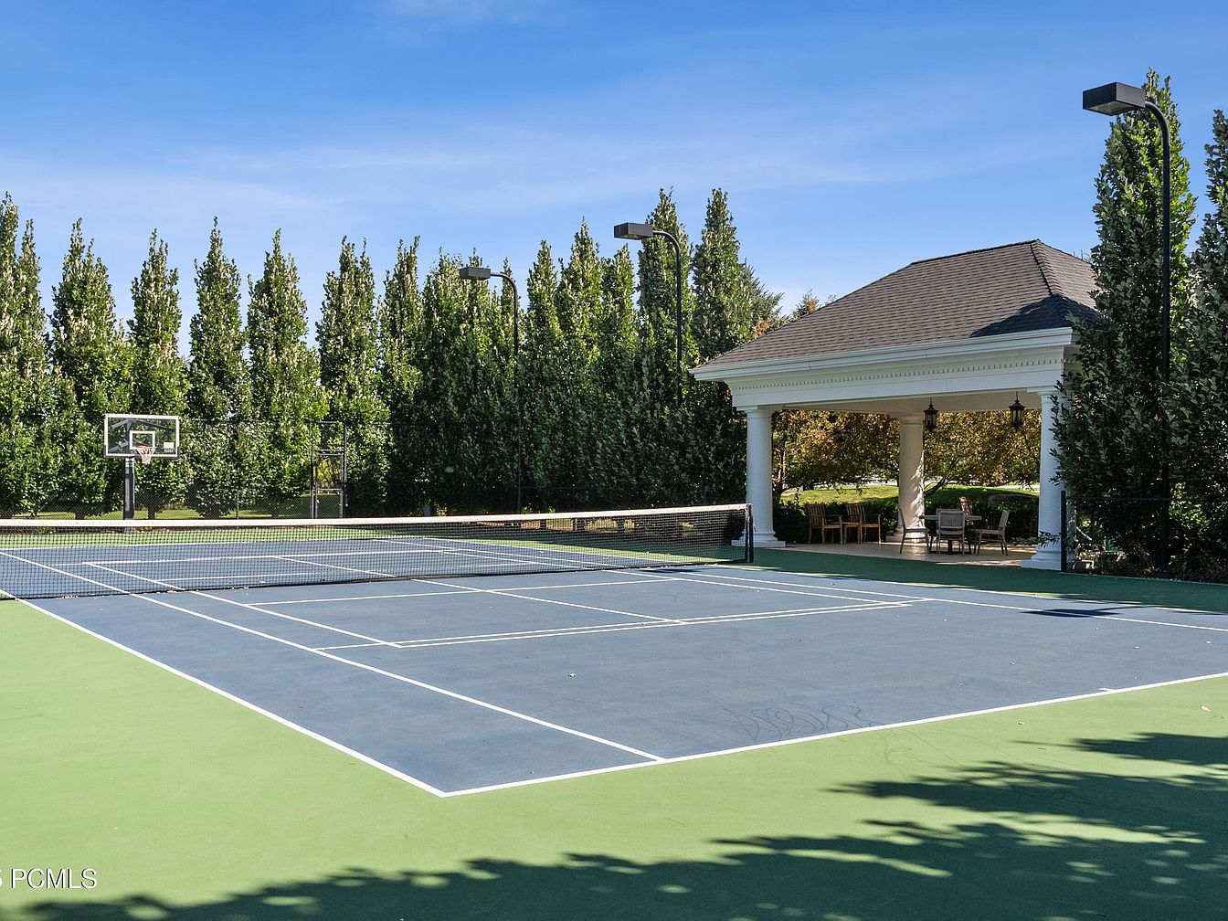 This exquisite outdoor space features a well-maintained tennis court framed by lush, tall trees providing an inviting atmosphere. The court’s blue surface is complemented by a vibrant green playing area, enhancing its appeal. Adjacent to the court, a charming pavilion offers shaded seating, perfect for family gatherings or relaxation between matches. With tasteful architectural details, including classic columns and elegant lamp fixtures, this setting effortlessly merges active lifestyle and leisure. Whether enjoying an intense game or casual hanging out, this area is designed to foster family bonding and outdoor enjoyment, ensuring fun-filled moments for all ages.