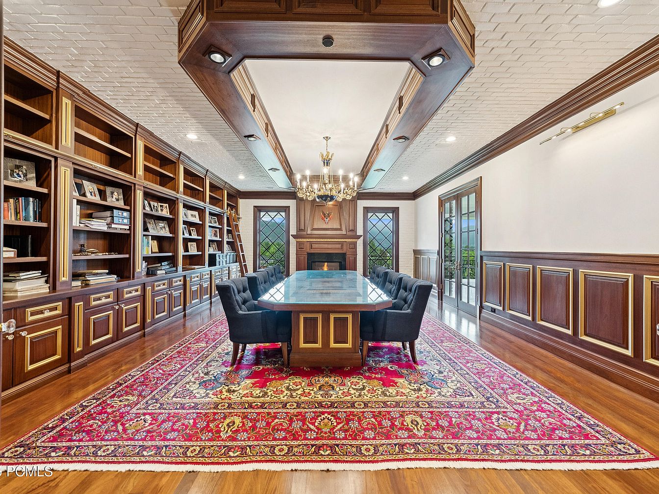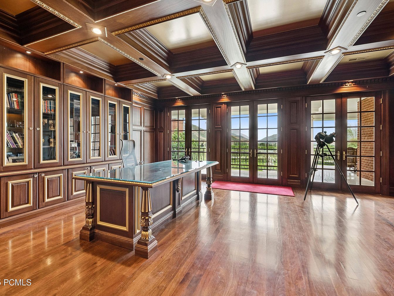 This sophisticated home office features a spacious layout illuminated by natural light streaming through stylish glass-paned windows. Rich wooden cabinetry lines the walls, offering ample storage for books and personal items, while gold accents add a touch of luxury. The centerpiece is an elegant table surrounded by plush, dark chairs, perfect for meetings or focused work. A vibrant red and gold area rug brings warmth to the hardwood floors, enhancing the inviting atmosphere. Architectural details like coffered ceilings and a stunning chandelier contribute to a refined yet comfortable environment, making it ideal for both productivity and relaxation.