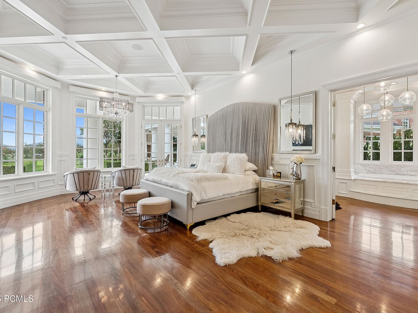 This luxurious master bedroom features a spacious layout with elegant architectural detailing. High coffered ceilings and a chic chandelier create a sophisticated ambiance, while large windows invite abundant natural light and showcase scenic views. A plush, tufted headboard complements the contemporary bed draped in soft linens, accented by decorative pillows for added comfort. Stylish metallic furniture, including a mirrored nightstand, adds a touch of glam, paired with cozy seating accentuated by faux fur rugs. The warm wooden flooring enhances the inviting atmosphere, making it a perfect family-friendly retreat for relaxation and rejuvenation.