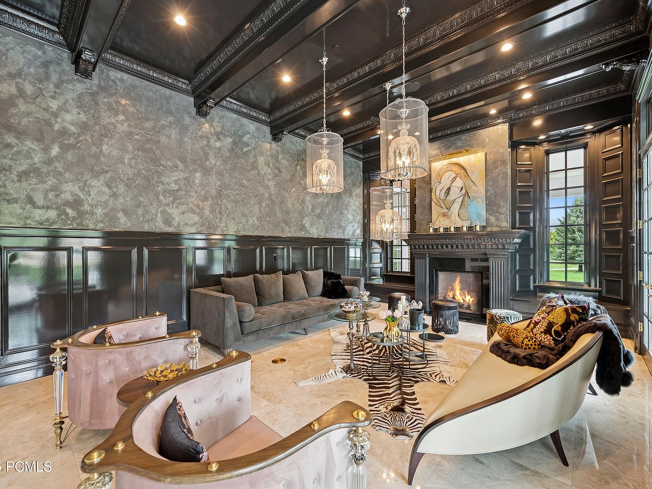 This elegant living room exudes sophistication with its striking dark palette and refined architectural details. A richly decorated ceiling with intricate moldings complements the glossy dark panels below. Plush seating options, including a stylish gray sofa and unique two-tone armchairs, create an inviting area for family gatherings, while a sleek glass coffee table adds a modern touch. The zebra-print rug brings warmth, contrasting beautifully against the elegant marble flooring. Suspended crystal pendant lights illuminate the space, highlighting a chic fireplace that serves as a focal point. Large windows invite natural light, enhancing the luxurious atmosphere.