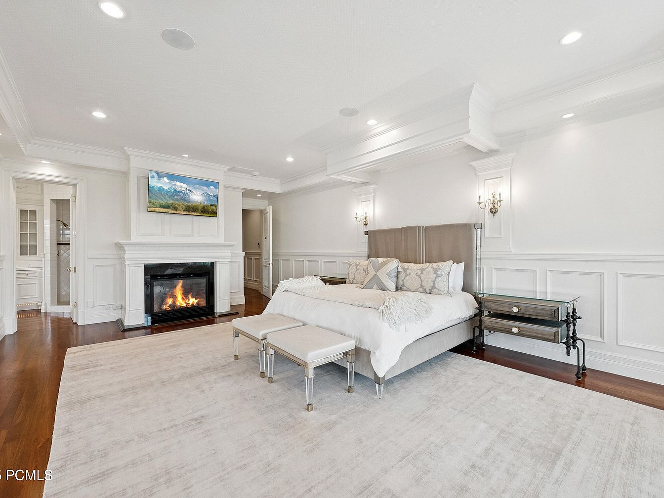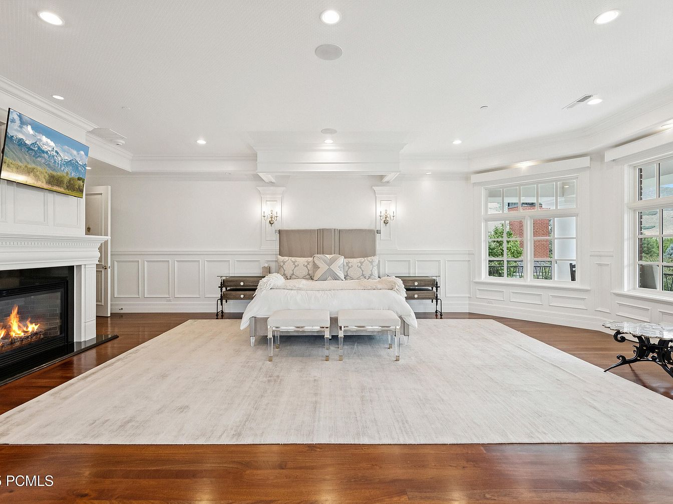 This spacious master bedroom blends elegance with comfort. The layout features a plush king-sized bed adorned with decorative pillows, flanked by sophisticated wall sconces that provide a warm glow. A sleek fireplace serves as a focal point, enhancing the cozy ambiance, while a large television mounted above adds modern convenience. The room’s color palette showcases soft whites and warm wood tones, complemented by a richly textured area rug beneathfoot. Notably, the wainscoting adds architectural interest. Ample natural light floods the space through large windows, creating an inviting environment perfect for relaxation and family moments.