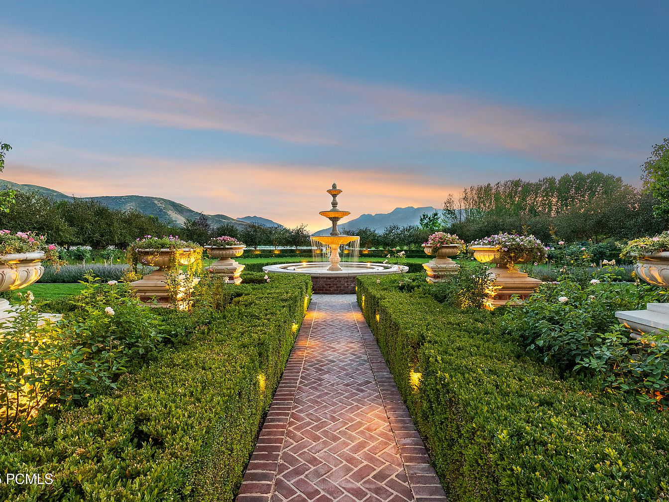 A stunning garden pathway features elegant brick pavers, leading towards a magnificent central fountain surrounded by lush greenery and vibrant flower beds. The meticulously trimmed hedges create a refined border, enhancing the luxurious feel of the outdoor space. Soft lighting illuminates the flowers in ornate stone planters, casting a warm glow as dusk approaches. This inviting layout merges aesthetic beauty with practical design, ideal for family gatherings or moments of tranquility. Beyond the garden, picturesque mountains provide a serene backdrop, completing a breathtaking view that elevates this garden into a personal sanctuary for relaxation and enjoyment.
