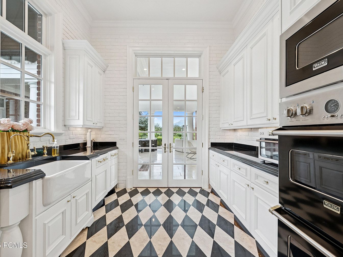 This sophisticated kitchen showcases a harmonious blend of classic and modern design elements. The striking black and white checkered flooring enhances the spacious layout, while the gleaming white cabinetry complemented by brushed gold fixtures adds a touch of luxury. Natural light floods through large windows, illuminating the decorative white brick walls. An oversized farmhouse sink, juxtaposed against the sleek black countertops, emphasizes functionality, ideal for family gatherings. High-end appliances are seamlessly integrated for convenience. French doors lead to an inviting outdoor space, creating a seamless transition between indoor and outdoor living, perfect for entertaining or quiet family dinners.