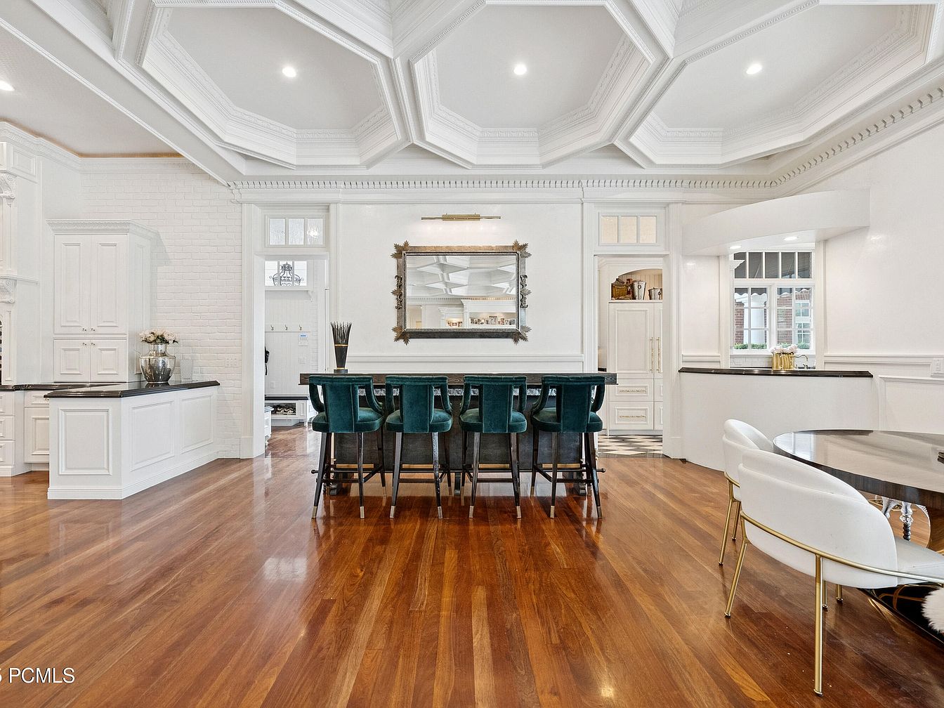 This elegantly designed dining area features a striking coffered ceiling that enhances the spaciousness and sophistication of the room. The rich hardwood flooring complements the pristine white walls, while a striking black countertop runs along the cabinetry. Velvet upholstered bar stools surround a contemporary dining table, inviting both casual meals and formal gatherings. Architectural details, such as intricate moldings and large windows flooding the area with natural light, add to the home’s charm. This family-friendly layout promotes interaction and connectivity, making it an ideal space for entertaining guests or enjoying cozy dinners with loved ones.