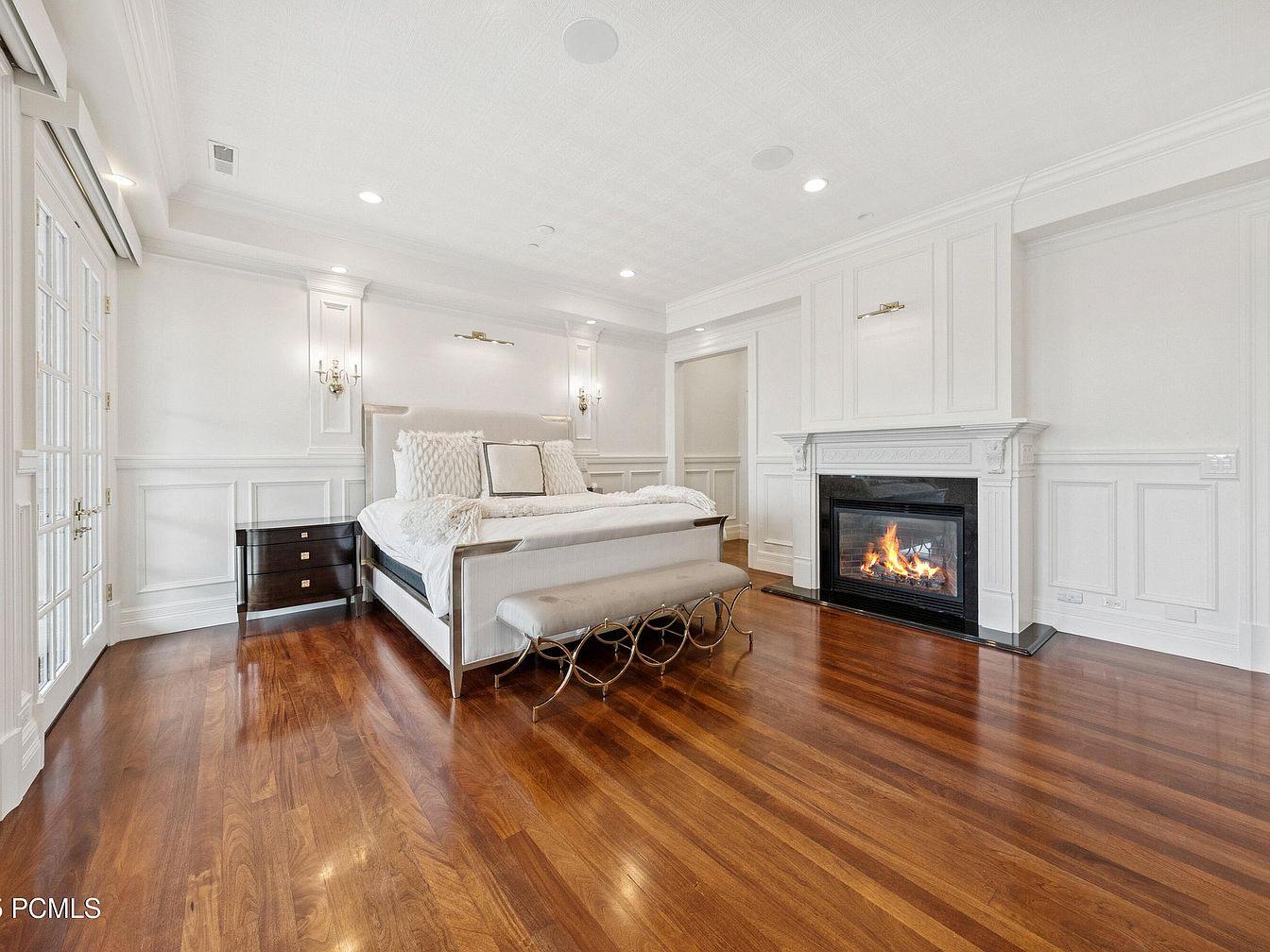 This master bedroom offers a luxurious retreat with its expansive layout and elegant design. A plush king-sized bed, adorned with decorative pillows, centers the room, creating a cozy yet sophisticated atmosphere. Rich hardwood floors contrast beautifully with the soft white walls, enhancing the sense of space and serenity. A stylish upholstered bench sits at the foot of the bed, while bedside tables with sleek hardware provide both functionality and aesthetic appeal. The fireplace, framed with detailed moldings, adds warmth and charm, perfect for tranquil evenings. Ample natural light floods in through French doors, creating an inviting, family-friendly ambiance.