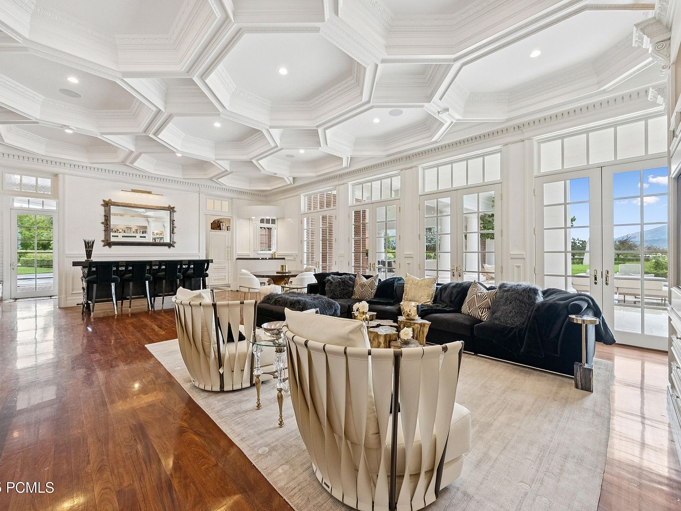 This elegant living space boasts a sophisticated, open layout. The coffered ceiling adds depth and intricacy, enhanced by recessed lighting that creates an inviting ambiance. A blend of rich wooden flooring and plush area rugs offers comfort beneath stylish furnishings. The seating area features sumptuous black sofas adorned with patterned pillows, complemented by unique accent chairs that showcase contemporary design. Large French doors flood the room with natural light, framing picturesque outdoor views and connecting the interior with nature. Ideal for family gatherings, this space effortlessly balances luxurious aesthetics with functionality, epitomizing modern living.