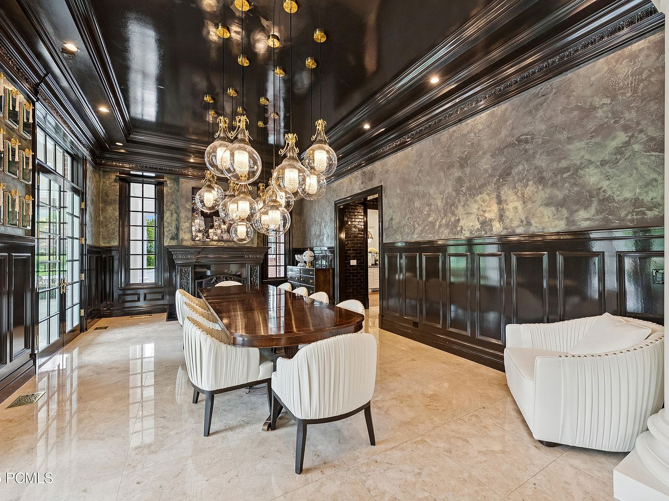 This elegant dining room features a striking design, highlighted by rich black paneling that adds depth and sophistication. A long, glossy wooden table dominates the space, surrounded by plush, ribbed white chairs that offer comfort while maintaining a chic aesthetic. The ceiling dazzles with unique glass pendant lights that create a warm, inviting glow. Large windows framed with classic trim allow natural light to flood the room, enhancing the textured, muted wall finishes. A cozy fireplace presents a focal point, perfect for family gatherings, while the polished marble flooring adds a touch of luxury, blending style with functionality.