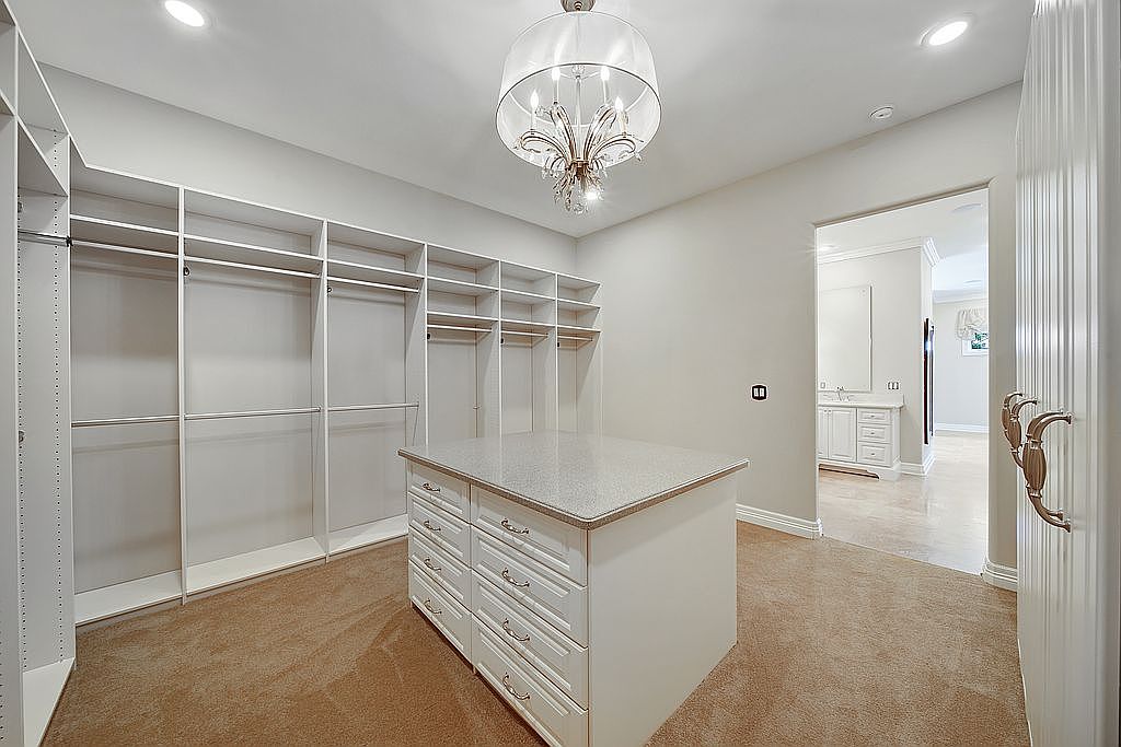 This stylish walk-in closet features an expansive layout designed for efficient organization and elegance. High-quality white shelving lines the walls, offering ample space for clothes and accessories, while a central island with drawers enhances functionality. The soft, carpeted flooring in a warm beige tone invites comfort, complementing the crisp white cabinetry. A glamorous chandelier illuminates the space, adding a touch of sophistication. The neutral color scheme promotes a soothing atmosphere, making it a serene retreat for daily routines. Conveniently placed outlets and nearby bathroom access highlight the family-friendly features of this thoughtfully designed area.