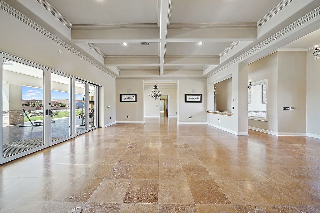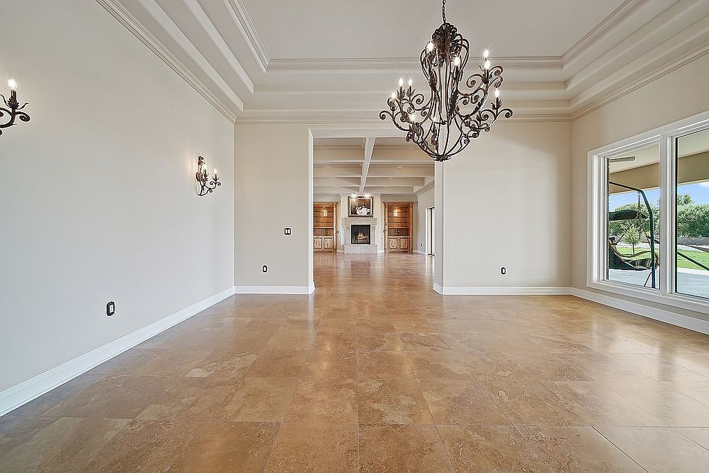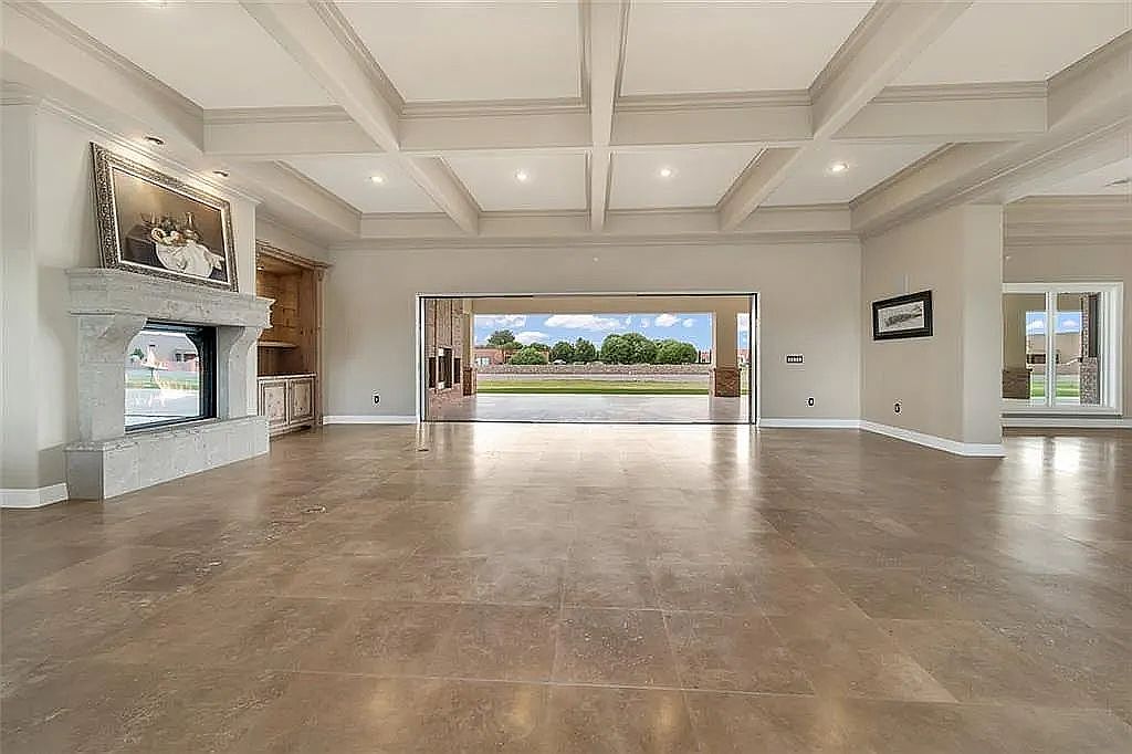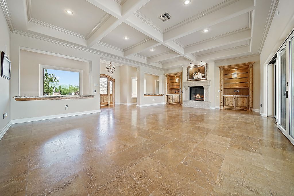 This spacious great room features an open layout, perfect for family gatherings and entertaining. The coffered ceiling adds an elegant touch, while large windows invite natural light and showcase the outdoor scenery. The neutral color palette of soft beige and warm cream creates a welcoming atmosphere that complements the natural stone flooring. A beautifully framed fireplace serves as a stunning focal point, flanked by custom built-in cabinetry, ideal for displaying books or family photos. Thoughtfully designed with ample space for furniture arrangements, this room offers versatility, comfort, and a sophisticated ambiance for everyday living.