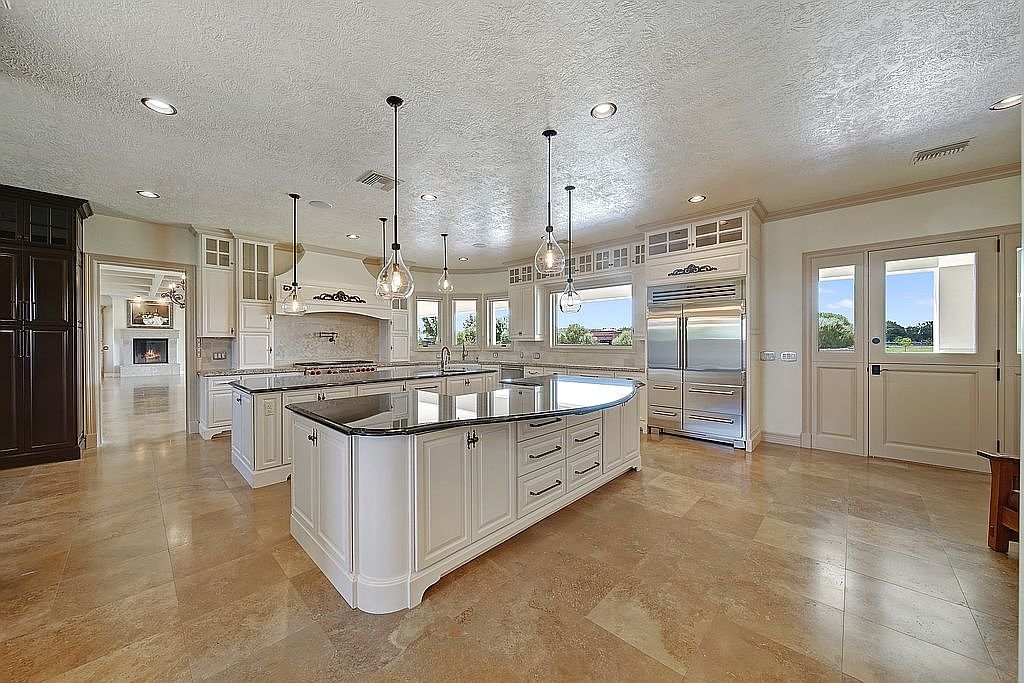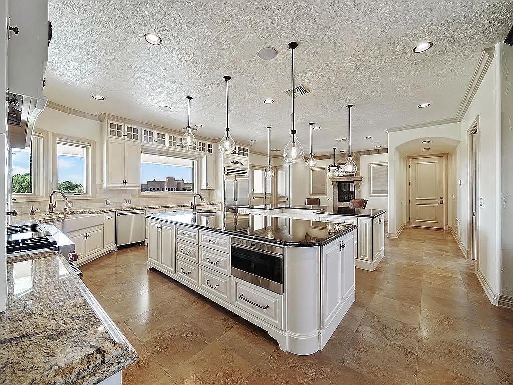 This spacious kitchen features elegant white cabinetry and a stunning granite countertop, harmonizing style and functionality. The open layout encourages family interactions with ample space for cooking and dining. Polished tile flooring complements the rich textures of the countertops, while large windows invite natural light, creating a warm and inviting atmosphere. Pendant lights provide stylish illumination above the central island, perfect for casual meals or gatherings. The layout includes modern appliances seamlessly integrated for efficiency, and the soft color palette enhances the inviting feel, making it an ideal heart of the home for family activities and entertaining guests.