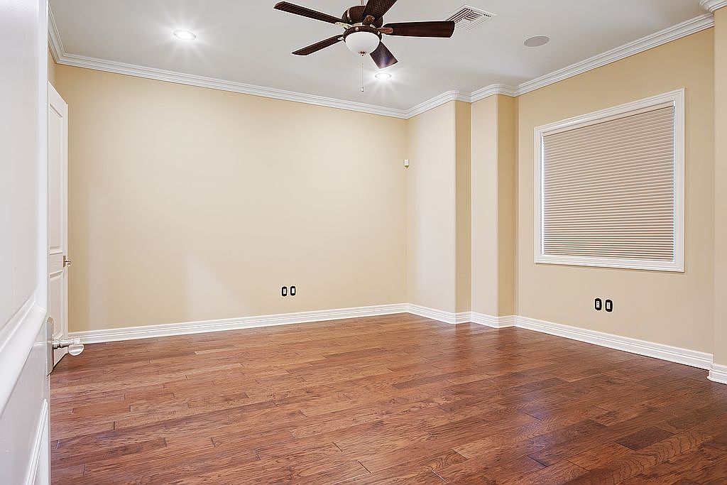 Featuring a spacious layout, this family room is bathed in warm beige tones that enhance its inviting atmosphere. Rich, polished hardwood floors add a touch of elegance, while the white crown molding introduces architectural charm. The ceiling fan, an efficient fixture, complements the overall design while ensuring comfort on warmer days. Natural light floods in through the window, adorned with blinds that provide privacy when needed. This space is perfect for family gatherings or quiet evenings, with ample room for furniture arrangements to suit various activities, creating a versatile hub for relaxation and interaction.