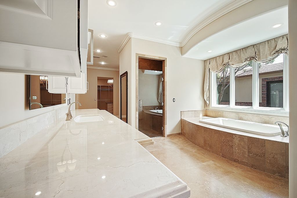 A spacious bathroom featuring a luxurious design with a hint of sophistication. The layout integrates a beautifully curved bathtub positioned by large windows, allowing natural light to illuminate the space. A stunning marble countertop complements the light-colored walls, enhancing the airy vibe. The cabinetry is classic and functional, providing ample storage while maintaining a clean aesthetic. Thoughtful details like recessed lighting and decorative window treatments add warmth and elegance. The nearby modern shower area and organized closet space promote functionality, making this retreat perfect for both relaxation and practicality for the whole family.