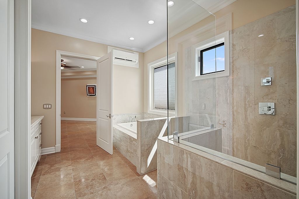 This spacious master bathroom features elegant neutral tones, with light beige walls complemented by luxurious stone tiles. Natural light pours in through a well-placed window, highlighting the sleek glass shower enclosure and a modern freestanding tub, perfect for relaxation. The layout ensures a seamless flow between wet and dry areas, integrating ample storage within stylish cabinetry. Thoughtfully designed, it balances functionality and aesthetics, offering modern fixtures and finishes. Family-friendly elements like a spacious countertop provide ample room for essentials, making this bathroom not only beautiful but also practical, ideal for a busy household.
