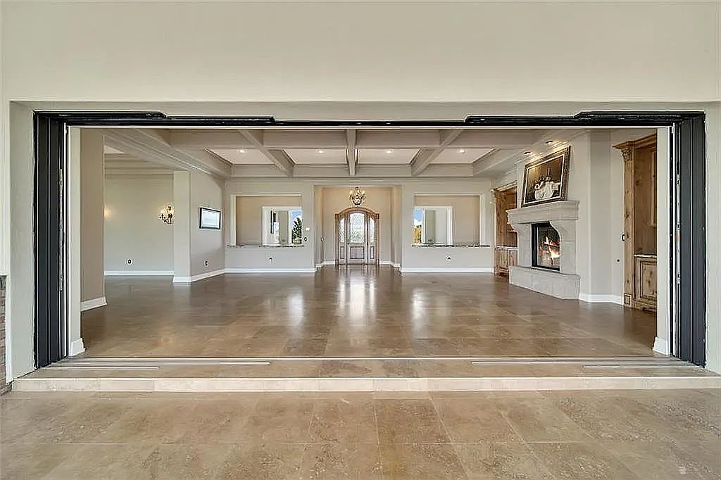 This expansive living room features an open layout with seamless transitions between indoor and outdoor spaces, thanks to elegant retractable glass doors. The neutral color palette, highlighted by soft cream and taupe tones, creates a warm and inviting ambiance. Beautiful coffered ceilings add architectural interest, while the stylish stone fireplace serves as a focal point. Luxurious marble flooring reflects light, enhancing the room’s spacious feel. Ample natural light floods through wide openings, and tasteful decorative features, like wall sconces and built-in cabinetry, complement the family-friendly design, making it perfect for gatherings and cozy evenings at home.