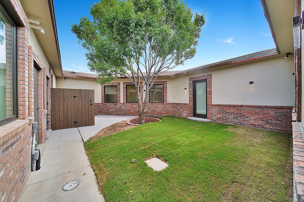 This inviting courtyard presents a serene outdoor space, designed for relaxation and family gatherings. Lush green grass borders a circular pathway that guides guests through the area, framed by warm brick walls that provide a rustic appeal. A mature tree adds shade and height, while the strategically placed exterior lighting enhances evening charm. The solid wooden gate introduces privacy, making it ideal for children to play freely. With its ample natural light and tranquil ambiance, this courtyard is perfect for morning coffee or evening conversations, showcasing a seamless blend of functionality and aesthetic simplicity.