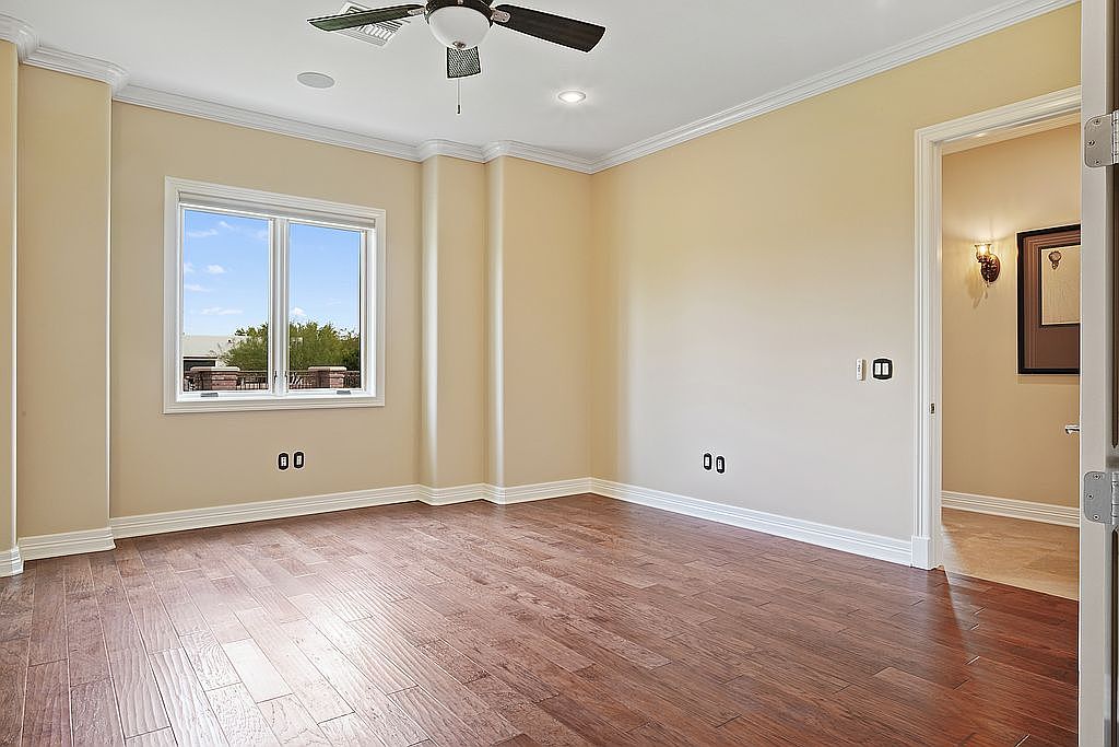 This inviting bedroom features a warm color palette of soft beige walls, creating a serene atmosphere ideal for rest and relaxation. Rich, dark hardwood floors provide a cozy contrast and add character to the space. The room’s layout is enhanced by tall windows that flood it with natural light, offering views of the outside and a refreshing connection to nature. Architectural details such as crown molding and recessed lighting elevate the aesthetic, while the ceiling fan ensures comfortable airflow. Adaptable and family-friendly, this room is perfect for various decorating styles, accommodating personalization with ease.