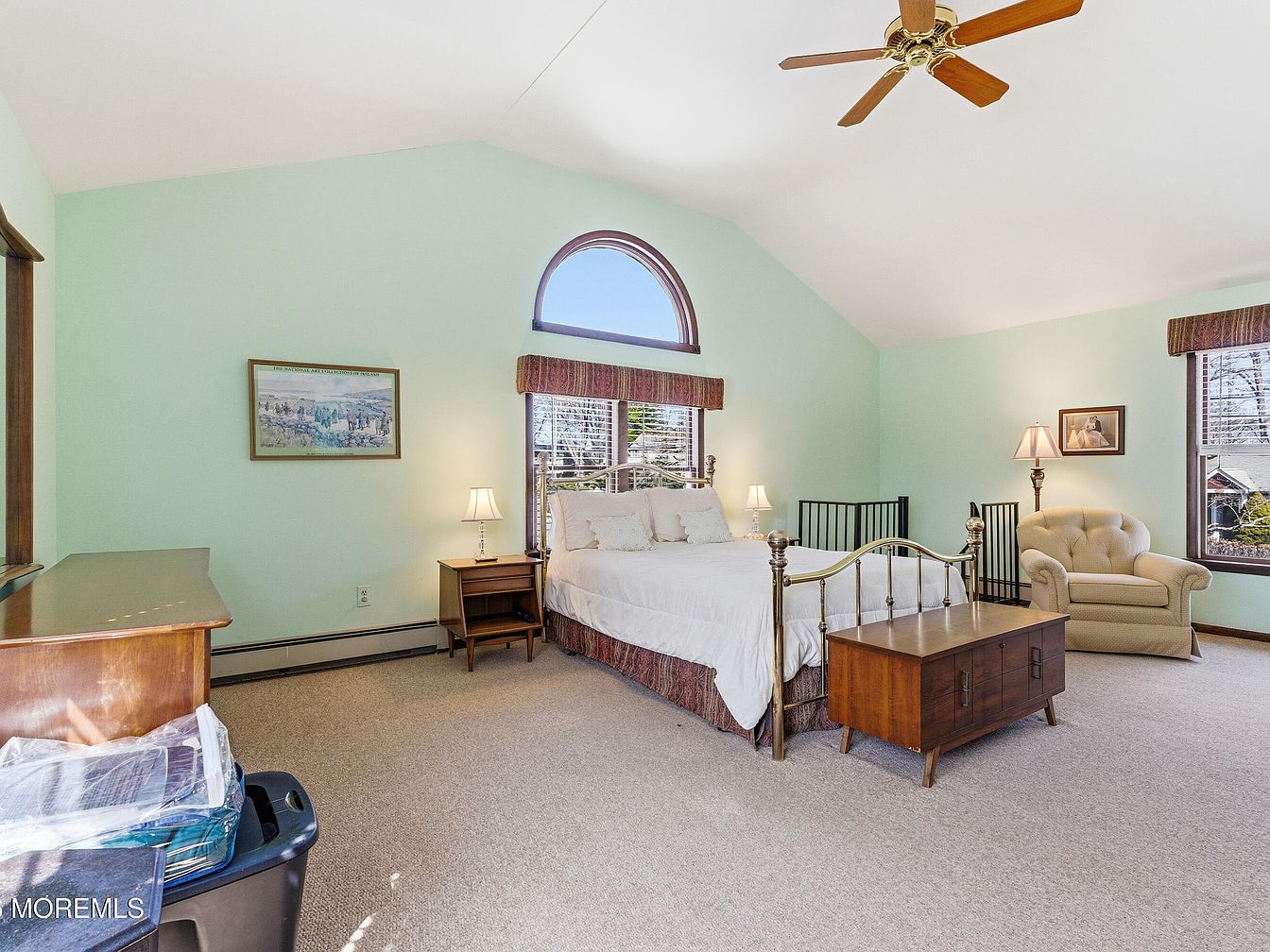 This spacious master bedroom showcases a tranquil ambiance with soft mint green walls and vaulted ceilings, creating an airy, open feel. A large window, adorned with a tasteful valance, invites natural light while offering views of the outdoors. The brass bed frame adds a touch of elegance, complemented by cozy bedding. Dark wooden furniture, including a charming nightstand and a vintage chest, enhances the warmth of the space. A plush armchair invites relaxation in the corner, making this room perfect for unwinding. The versatile layout provides ample space for family interactions, making it a true retreat.