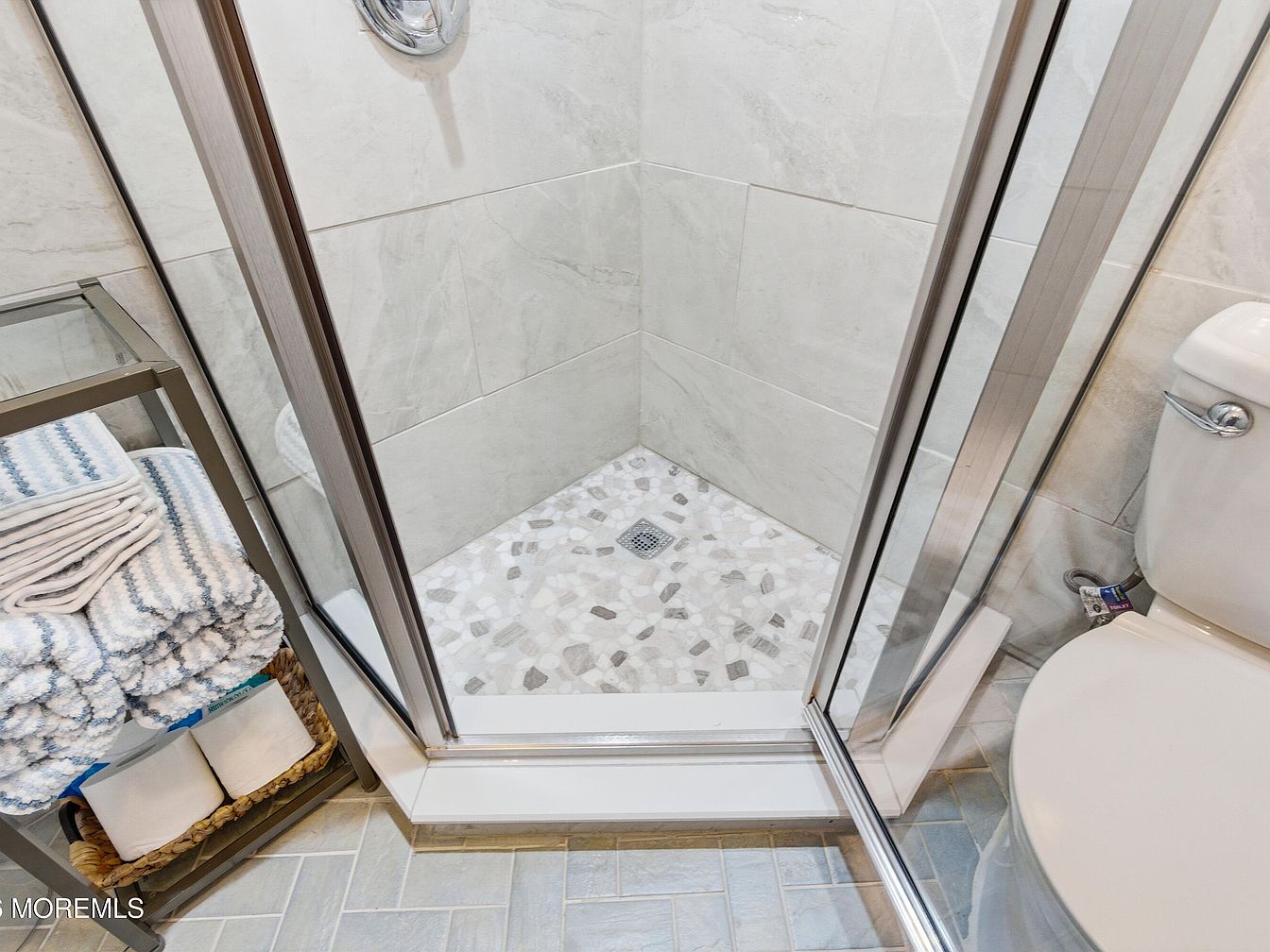 This contemporary shower space features sleek, glass enclosures that maximize light and visual space. The subtle gray and white tilework creates a calming atmosphere, complemented by the stunning mosaic floor design that draws the eye. Functional yet stylish, the space includes neatly stacked towels on a minimalist rack, enhancing organization while maintaining an elegant look. The smooth lines of the modern toilet add to the room’s aesthetic cohesion. Ample space ensures comfort, making it family-friendly. With its polished finishes and thoughtful layout, this shower area embodies both luxury and practicality, perfect for daily relaxation.