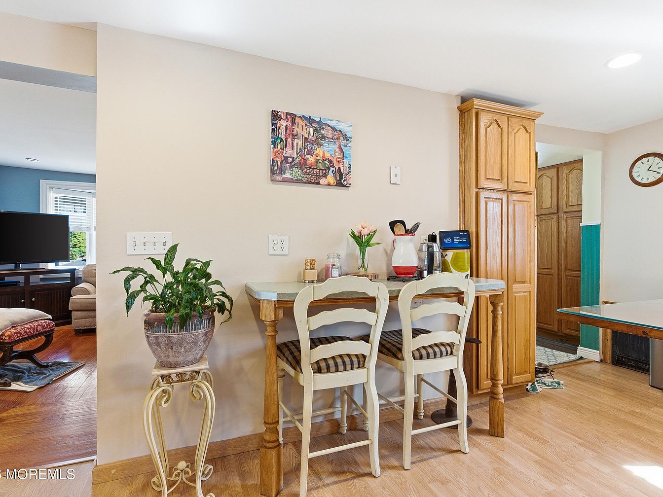 This inviting kitchen nook features a charming blend of functionality and warmth, perfect for family gatherings. Light-toned cabinetry complements the warm wooden flooring, while the streamlined breakfast bar adorned with cream-colored stools invites casual dining. A touch of greenery from the potted plant adds freshness to the space, enhancing its welcoming vibe. The subtle color palette of soft neutrals is accented by vibrant artwork, creating a lively backdrop. Nearby, essential kitchen appliances are conveniently positioned, ensuring effortless meal preparation. This cozy area embodies a perfect blend of comfort and style, ideal for both cooking and casual conversations.