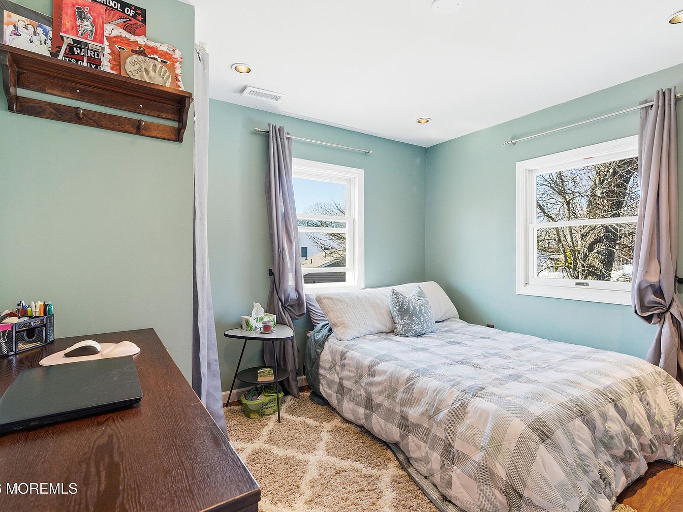 This cozy bedroom features a serene color palette of soft blue-green walls, creating a calming atmosphere perfect for relaxation. Natural light floods the room through two windows, enhancing the airy feel. The bed, adorned with a stylish plaid comforter, is positioned against a wall, maximizing space and comfort. A plush area rug adds warmth underfoot, while a simple, functional desk provides a workspace for study or creative tasks. Decorative accents, including framed artwork and a wooden shelf displaying personal mementos, give the room character. The elegant curtain drapes offer privacy while maintaining a light and open ambiance.