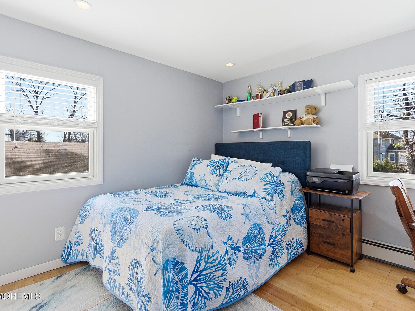 This cozy bedroom features a serene color palette of soft grays and vibrant coastal blues, creating a refreshing and inviting atmosphere. The prominent blue patterned bedding harmonizes beautifully with the light walls, enhancing the natural light pouring in through the large window. Well-placed shelving above the bed showcases trophies and personal mementos, adding a touch of personality and warmth. A functional desk area complements the layout, ideal for study or work. The natural wood flooring adds warmth and character, while efficient window treatments ensure privacy without sacrificing light. This space is perfect for relaxation and inspiration.