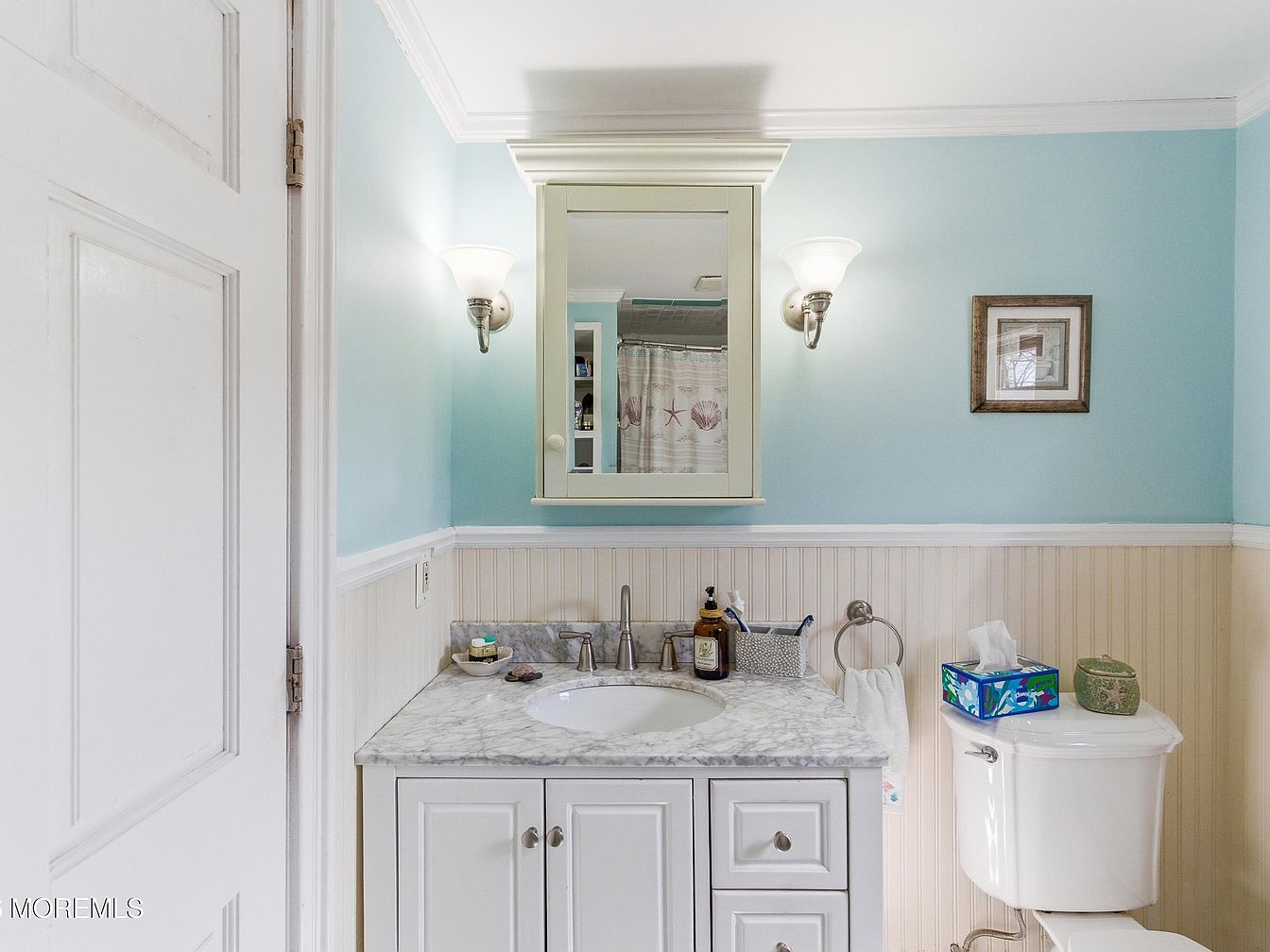 This serene bathroom features a charming layout with a light blue color scheme that exudes tranquility. The elegant marble countertop flows seamlessly over white cabinetry, providing ample storage for toiletries while maintaining a sleek look. Above, a well-lit mirror reflects the space, illuminated by two sconces, enhancing the inviting ambiance. The subtle beadboard paneling adds texture and warmth to the room, perfectly contrasting with the smooth walls. Thoughtfully placed decor, including a framed picture and small decorative items, offers personal touches, creating a family-friendly environment that balances style and functionality.