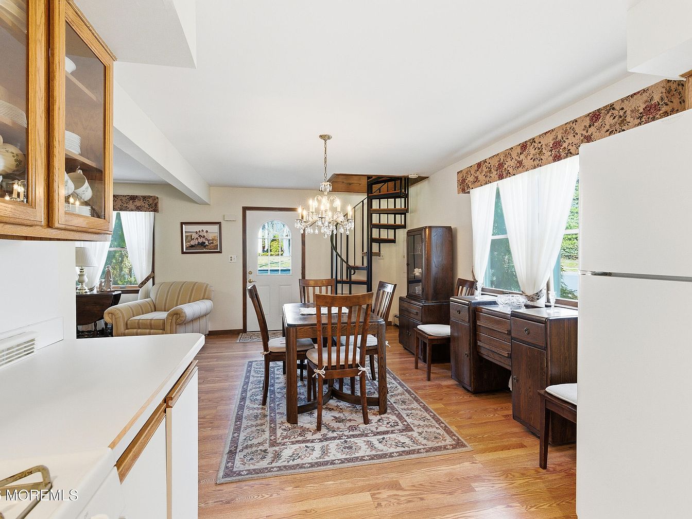 This inviting dining area perfectly blends comfort and style, featuring a classic wooden dining table surrounded by matching chairs, ideal for family meals. A spiral staircase leads to an upper level, adding a unique architectural feature and maximizing space. Natural light floods the room, thanks to large windows adorned with soft drapes, enhancing the warm color palette of cream and brown. Rich wooden flooring complements the furnishings, while a decorative rug adds texture and warmth. The layout encourages interaction, making it a welcoming space for gatherings, with thoughtful details like a china cabinet for displaying cherished items.