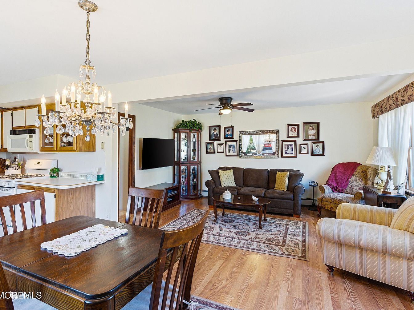 This inviting dining room features a warm and open layout, seamlessly connecting to the adjacent living space. Light oak cabinetry enhances the charm, while a classic chandelier adds a touch of elegance. The rich wooden dining set, complete with comfortable chairs, invites family gatherings. Soft floral valances frame the windows, allowing natural light to flood the room, enhancing its welcoming ambiance. The hardwood flooring complements the earthy color palette, harmonizing with the tasteful decor. A cozy seating area with striped upholstery adds a quaint charm, while the decorative rug ties together the aesthetic, making this space perfect for family meals.