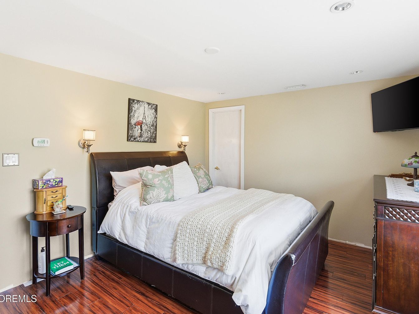 This inviting master bedroom combines comfort with style, featuring a spacious layout that invites relaxation. The rich, dark wooden flooring complements the warm beige walls, creating a cozy atmosphere. A plush king-sized bed serves as the centerpiece, adorned with soft white linens and decorative pillows infused with floral motifs. Flanking the bed are elegant wall sconces that provide soft, ambient lighting. A sleek dresser adds functionality, with vintage accents that enhance the room’s charm. Practical elements include a bedside table for convenience, ensuring a perfect balance of aesthetics and family-friendly comfort, ideal for restful nights.