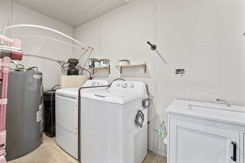 This functional laundry room features a clean and organized layout, maximizing efficiency for household chores. The space is equipped with a pair of white washing machines, positioned side by side for easy access. Above, floating shelves provide additional storage for detergents and cleaning supplies, ensuring everything is within reach. A sleek white sink complements the room, enhancing practicality. The neutral color palette, punctuated by stainless steel elements, offers a modern and fresh ambiance. Ideal for family use, this space is designed for ease of cleaning, making laundry days less of a chore and more streamlined.