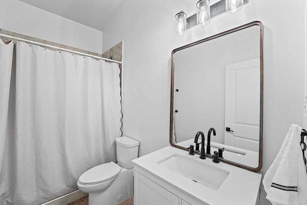 This modern bathroom showcases a clean and airy design, featuring a minimalist aesthetic. The white walls and bright lighting create an open atmosphere, while the elegant black fixtures add a touch of sophistication. A spacious, frameless mirror enhances depth and light reflection, complemented by stylish light bulbs overhead that provide ample illumination. The sleek vanity with a solid countertop offers practicality and style, paired with a simple, white shower curtain that promotes a serene vibe. Family-friendly elements include easy access and maintenance throughout, making it a comfortable space for everyday use.