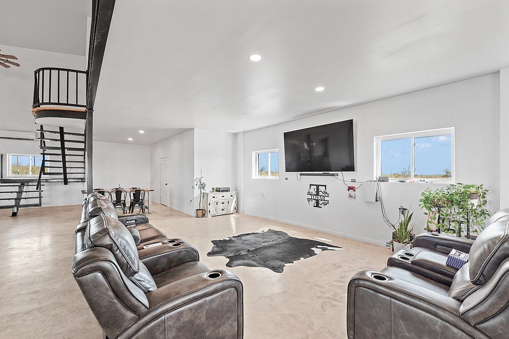 This spacious living room seamlessly combines comfort and style, featuring plush reclining chairs arranged for optimal viewing of the large wall-mounted TV. The neutral color scheme exudes tranquility, complemented by natural lighting streaming through multiple windows. A rustic cowhide rug anchors the modern aesthetic while the spiral staircase adds a touch of architectural intrigue, leading to an upper level. The concrete flooring enhances durability and low maintenance, ideal for family gatherings. Potted plants introduce a refreshing element of nature, creating a warm and inviting atmosphere perfect for relaxation or entertaining guests.
