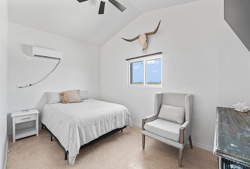 This inviting bedroom features a serene ambiance, highlighted by a crisp white color palette that enhances the space’s brightness. A plush queen-sized bed, adorned with a textured bedding, offers comfort and relaxation. The distinct high ceiling adds an airy feel, complemented by a stylish ceiling fan. A large window allows natural light to stream in, framing picturesque views of the outdoors. The accent chair, upholstered in soft gray, invites quiet moments, while the rustic wall decor including a longhorn skull adds a touch of character. The minimalistic nightstand echoes modern design, making this room both functional and chic.