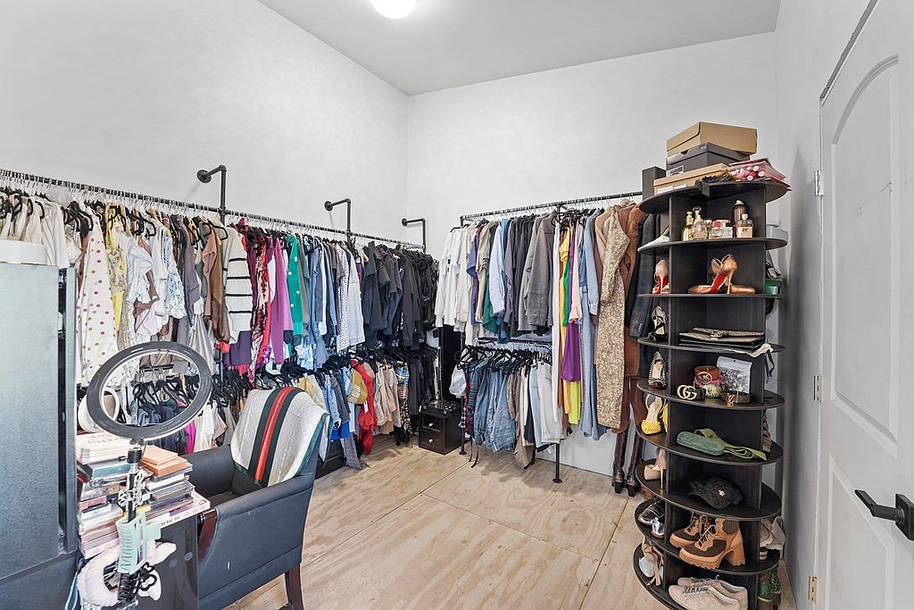 This thoughtfully designed walk-in closet offers ample storage space with hanging racks and creative shelving. The vibrant arrangement of clothing ranges from casual wear to elegant outfits, showcasing a delightful color palette that brings energy to the room. An inviting chair provides a cozy spot for outfit selection, complemented by a circular shoe rack displaying stylish footwear and accessories. Soft, neutral walls enhance the brightness of the room, paired with a warm wood floor that adds texture. This family-friendly space encourages organization while reflecting personal style, making dressing an enjoyable daily experience.