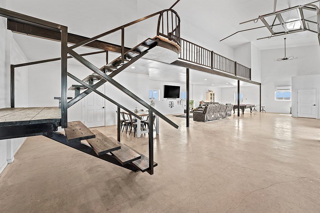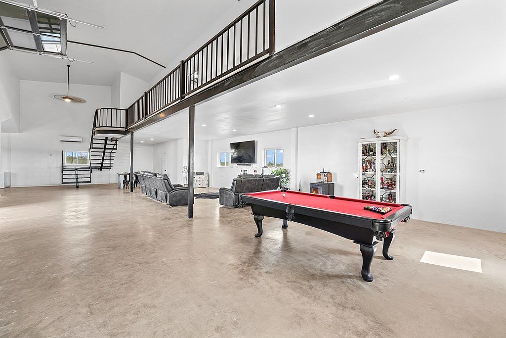 This expansive game room offers a perfect blend of leisure and modern design. The polished concrete floor complements the high ceilings, creating an airy atmosphere. A stylish black pool table takes center stage, flanked by comfortable seating that invites family gatherings. The open layout is accentuated by large windows, bathing the space in natural light. Sleek, minimalist decor enhances its contemporary feel, while the wooden railing and spiral staircase lead to a cozy upper loft hinting at additional recreational space. Ample room for entertainment is balanced with elements of functionality, making it ideal for family fun.