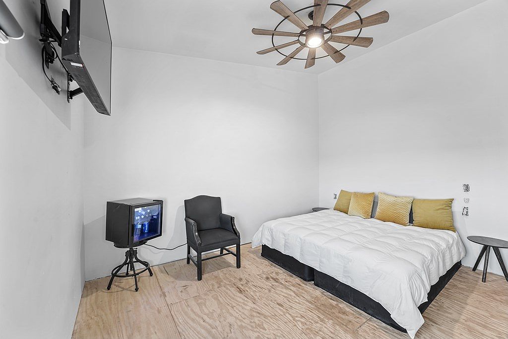 This cozy bedroom features a minimalist design that promotes relaxation. The space is anchored by a sleek, low-profile bed dressed in a crisp white duvet, complemented by vibrant yellow accent pillows that add a pop of color. A stylish black armchair provides a comfortable reading nook, while a modern ceiling fan with wooden blades enhances airflow, making it perfect for warm nights. A wall-mounted TV caters to entertainment needs. The natural light filtering through the room creates an airy ambiance, while light wood flooring adds warmth, making it an inviting retreat for families and guests alike.