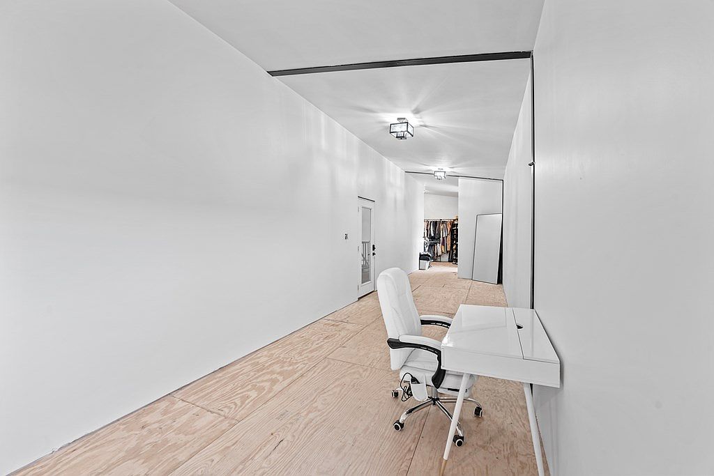 This home office space features a clean, minimalist design that promotes focus and creativity. The bright white walls enhance the sense of openness, allowing natural light to reflect throughout the area. A sleek, white desk and ergonomic chair are positioned for comfort and productivity, perfect for remote work or studying. The light wood flooring adds warmth, contrasting beautifully with the crisp walls. This area is designed with family-friendly features in mind, providing a dedicated space for concentration while still being accessible. Simple yet elegant light fixtures contribute to an inviting atmosphere, making it the ideal workspace.