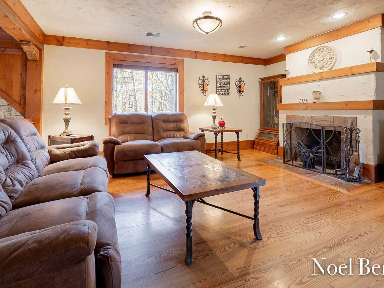 This inviting living room features a harmonious blend of rustic charm and modern comfort. The warm wooden beams and polished wooden flooring enhance the space’s cozy aesthetic. Plush, brown recliners provide ample seating for family gatherings, while a stylish coffee table adds a touch of elegance. A decorative fireplace serves as a focal point, complemented by wrought iron accents and soft ambient lighting. Natural light floods in through the large window, offering a serene view of the outdoor surroundings. Family rules art piece on the wall adds a personal touch, creating a welcoming atmosphere perfect for relaxation.